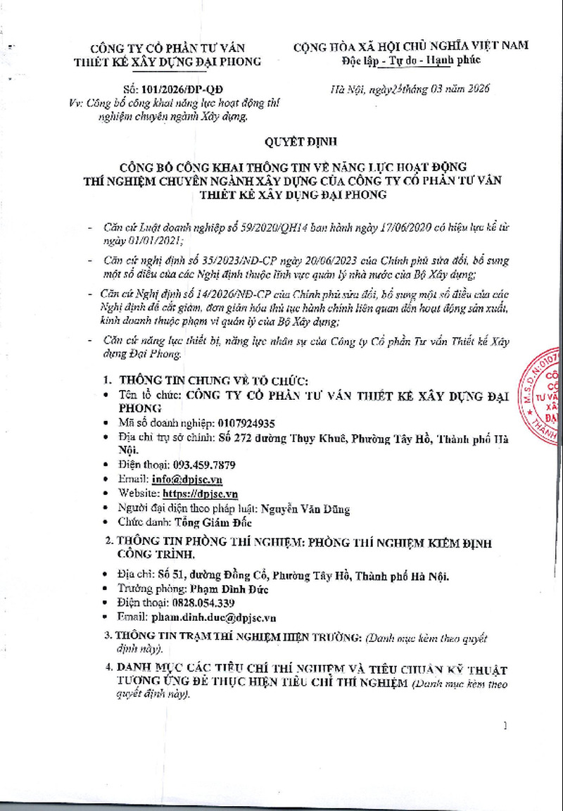 | Heading | Quyết định công bố công khai thông tin về năng lực hoạt động thí nghiệm chuyên ngành xây dựng của công ty cổ phần tư vẫn thiết kế xây dựng Đại Phong | ||