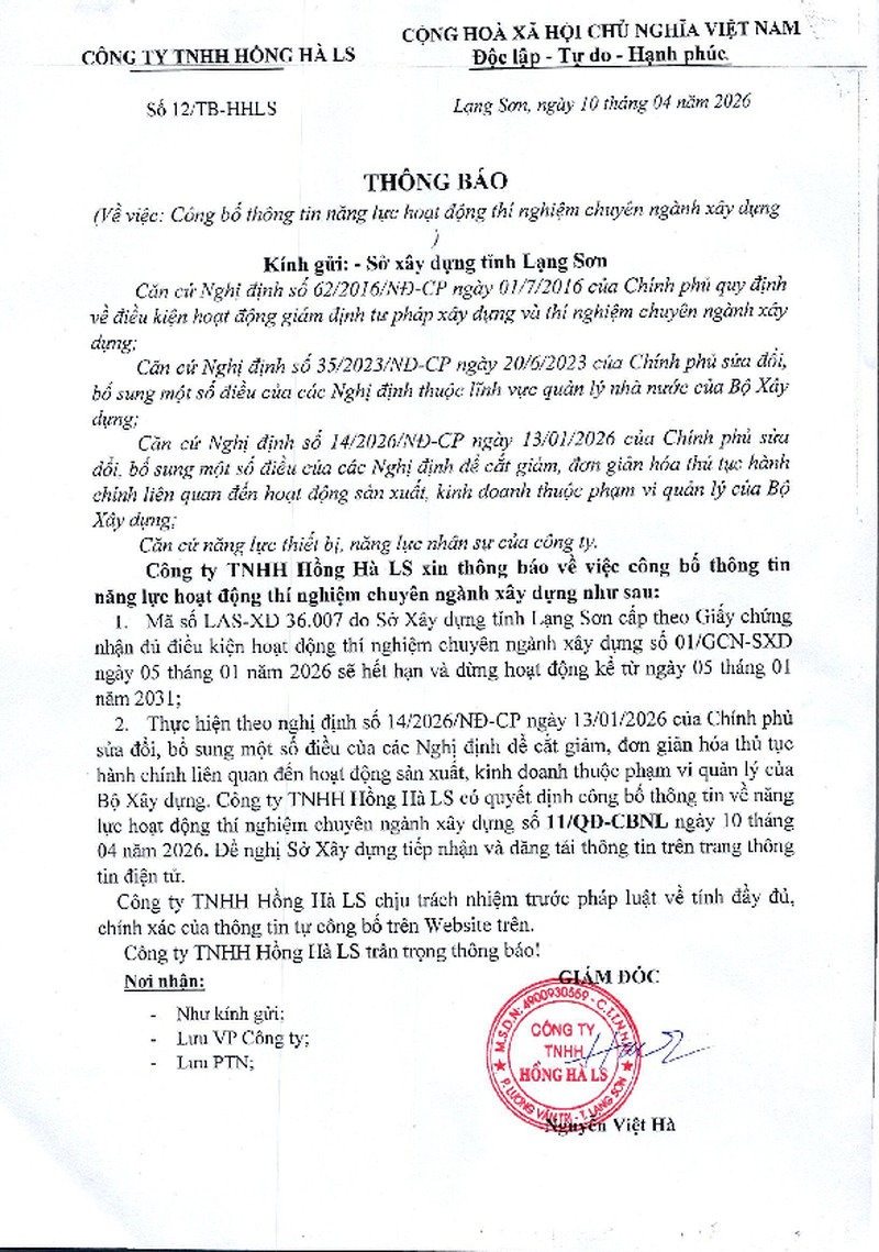 | Tiêu đề văn bản | Công bố thông tin các chỉ tiêu thí nghiệm đủ điều kiện hoạt động thí nghiệm chuyên ngành xây dựng (Công ty TNHH Hồng Hà LS) | ||
