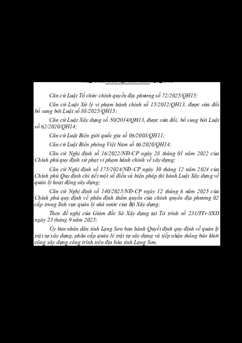 Tiêu đề văn bản | Ban hành quy định về quản lý trật tự xây dựng, phân cấp quản lý trật tự xây dựng và tiếp nhận thông báo khởi công xây dựng công trình trên địa bàn tỉnh Lạng Sơn | ||