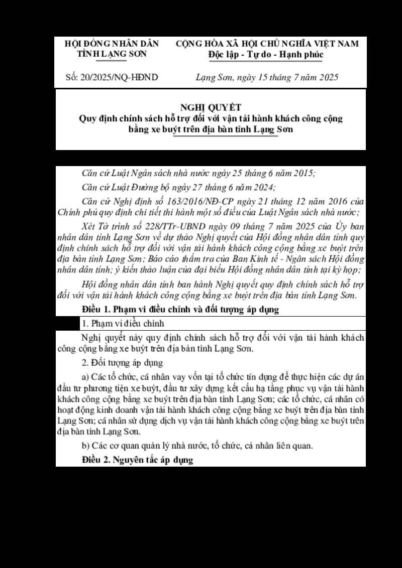 Tiêu đề văn bản | Nghị quyết Quy định chính sách hỗ trợ đối với vận tải hành khách công cộng bằng xe buýt trên địa bàn tỉnh Lạng Sơn | ||