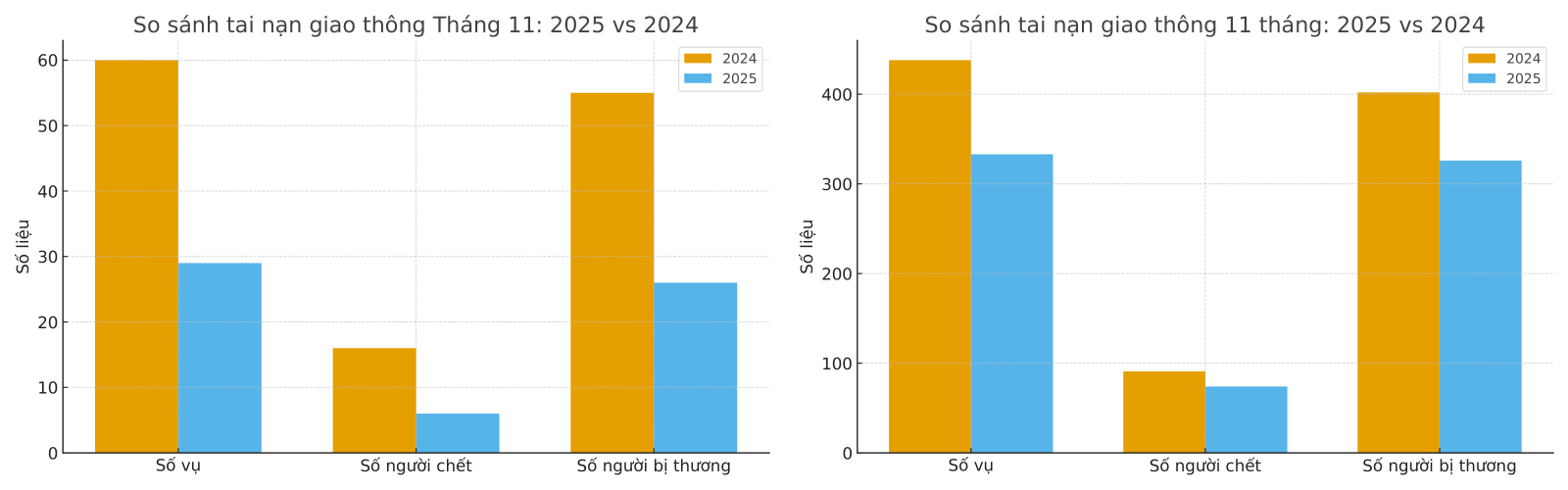 Biểu đồ. So sánh tai nạn giao thông tháng 11 và 11 tháng đầu năm 2025 với cùng kỳ năm 2024