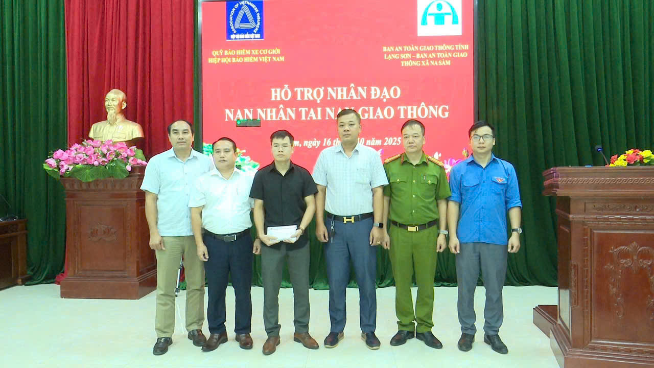 Chiều 17/10, Ban An toàn Giao thông tỉnh Lạng Sơn phối hợp với Quỹ Bảo hiểm xe cơ giới - Hiệp hội Bảo hiểm Việt Nam và Công ty Bảo Minh Lạng Sơn tổ chức trao tiền hỗ trợ cho gia đình có nạn nhân tử vong do tai nạn giao thông tại xã Na Sầm và xã Kháng Chiến.