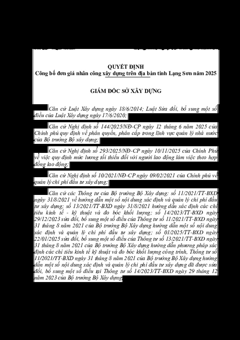 | Tiêu đề văn bản | Quyết định công bố đơn giá nhân công xây dựng trên địa bàn tỉnh Lạng Sơn năm 2025 | ||
